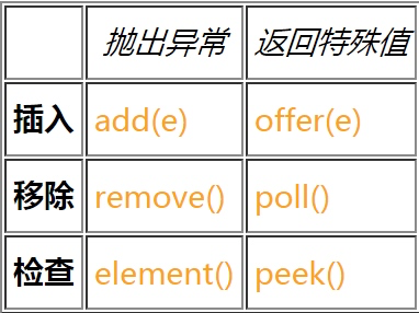 Queue继承于Collection,除了基本的 Collection 操作外,队列还提供其他的插入、提取和检查操作。每个方法都存在两种形式:一种抛出异常(操作失败时),另一种返回一个特殊值(null 或 false,具体取决于操作)。